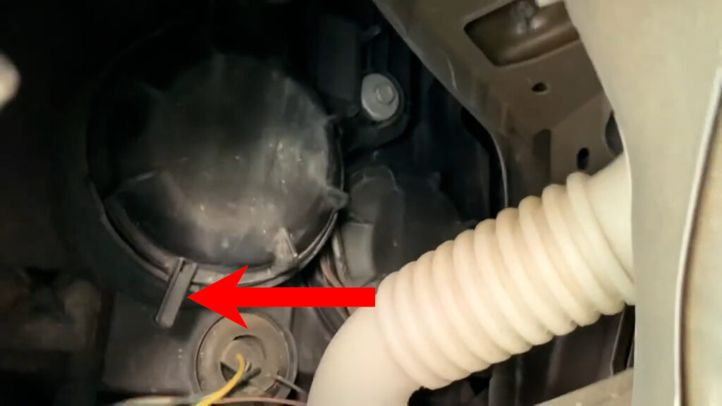 After you have removed the access cover you will now remove the cover to the headlight. It is a round piece of plastic with another plastic piece pointing down. Grab that circle cover and turn it counter clock wise to remove. Remember that plastic pieces points down when in the locked position which will come in handy when putting it back in place.